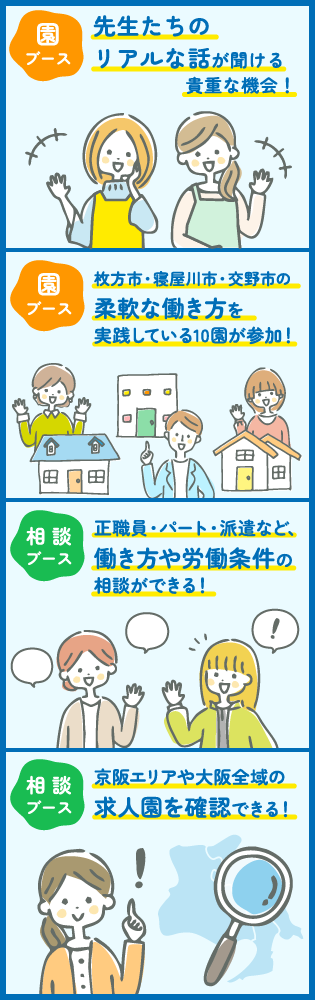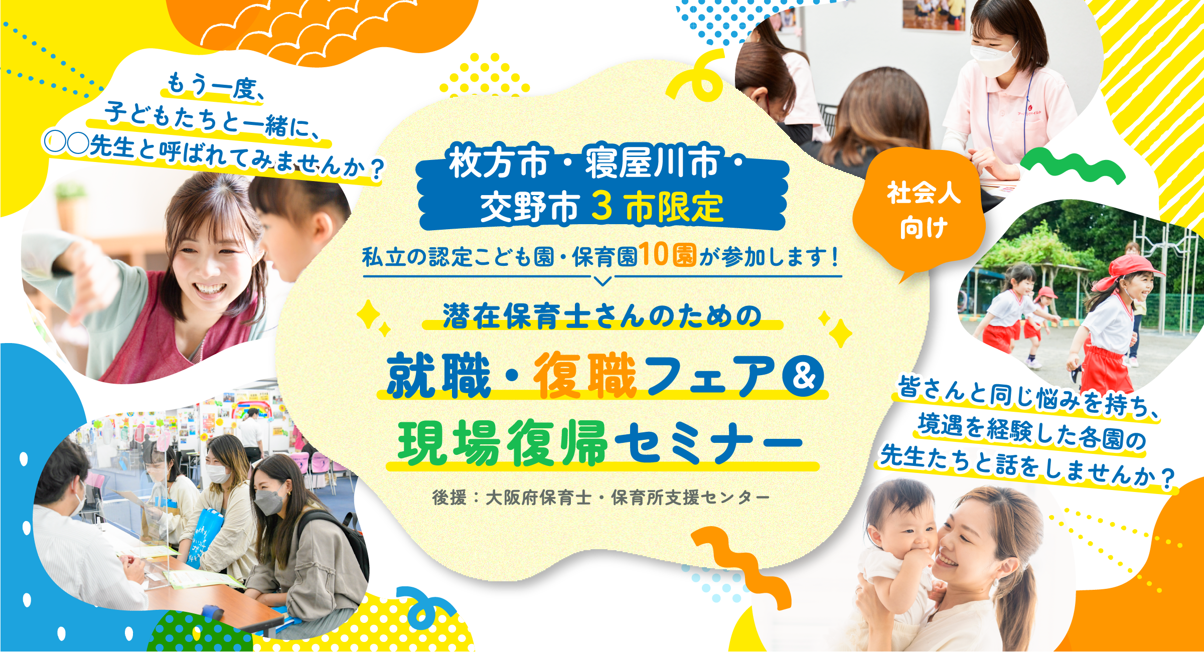 枚方・寝屋川・交野市の求人園情報、京阪エリア全域の求人園情報、正職員・パート・派遣など働き方の相談、派遣保育士の働き方、派遣登録、お仕事紹介、研修会など