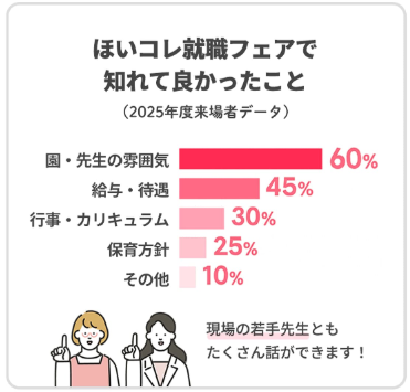 過去の開催(2日間)では1000以上の保育園やこども園が参加した実績があり(2025年開催時)、一日のうちにたくさんの園の「生の声」を直接聞くことができる貴重な機会となっています。 このフェアは、単に情報をもらうだけでなく、働き方を大きく変えるきっかけの場所として機能しています。