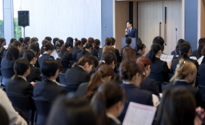 受付時は緊張していた学生さんも、なかやまきんに君の登場でリラックスしてガイダンスの話を聞いてくれていました♪