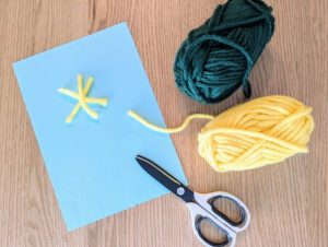 ① 毛糸を必要な長さに切って、画用紙の上で並べながら構図を決める。