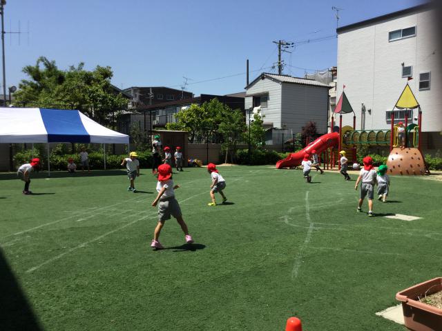 日課活動、体育ローテーション、専科(英語・体操・音楽)活動など行います。活動のポイントは「ほめること」「楽しいがちょうどいい」「教えて教えず」です。また悲しい、つらい時はギュッと抱きしめます。この安心感があってこそチャレンジの心が生まれ可能性や能力が発揮されます。頑張った成果は自信につながり自己肯定の気持ちが強くなります。