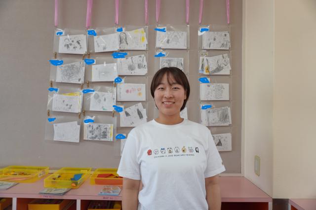 - 2歳児の担当をしています。1年間の中で子どもたちが友だちと一緒って楽しいなと思えるように子どもたちと一緒に遊んでいます。今年度は園芸係として菜園活動に取り組んでいます。クラスの子どもたちと野菜の苗え植えや水やり、収穫を一緒にしています。カボチャやトマト、キュウリが実となり収穫したものを食べ、食育に繋がるようにしています。