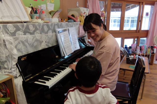 ピアノを弾いたり、給食の配膳、各月の制作(準備など)、行事に向けての準備、日々楽しめる保育を考えています。