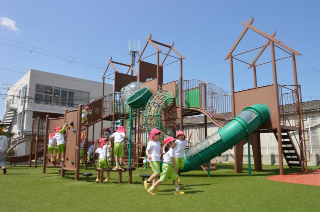 ”幼保連携型認定こども園”へ移行して、今まで以上に子どもと先生たちが過ごしやすい環境が整っています。園庭には、暑さ対策の日除けタープを設置しました。