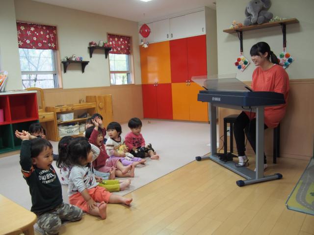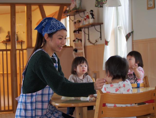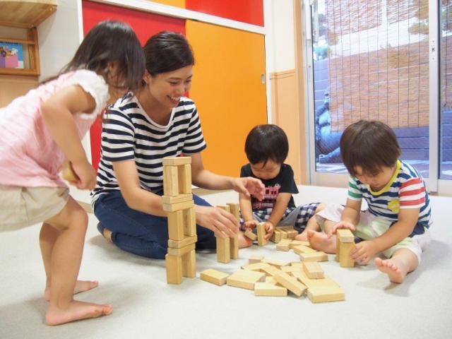 何もかも皆で一斉にするのではなく、子どもたちが自分で選んだ遊びを私たちが援助し、そして見守ります。遊びを選択しやすいように「ままごとコーナー」「絵本のコーナー」「芸術のコーナー」「積み木のコーナー」に分け、それぞれのコーナーに遊びが広がるようなおもちゃや道具を私たちが用意しています。子どもたちが自主的に遊ぶ中で「気持ちに寄り添うこと」そして「距離を置いて見守ること」を大切にしています。また、遊びのなかでこどもたちとたくさん会話しています。自分の気持ちや考えたことを言葉にして伝えあうことが重要と考えています。