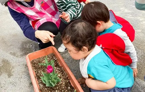 近隣の街並みや公園には木々が多く季節の移り変わりがよくわかるので、天気の良い日は散歩をかねて遊びに行き、自然に触れる保育をしています。