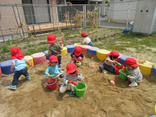 自然環境豊かな園庭で、砂遊び・三輪車など伸び伸びと過ごし、園庭内の畑ではキュウリ・ピーマンなどの夏野菜を育てたり、季節を感じられる花を植えたり、虫取りを楽しむなど子どもたちと一緒に楽しく過ごしてしています。