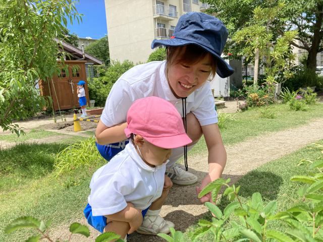 園庭には草花や昆虫もいて、ダンゴムシやアリの大群を見て驚いたり、たんぽぽの綿毛で遊んだり。