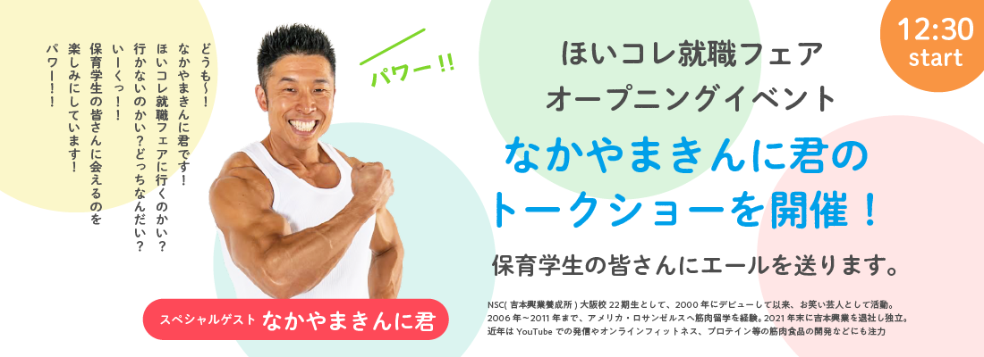 なかやまきんに君トークショー! 保育学生の皆さんにきんに君が熱いエールを送ります! 終了後には就活サポーターからフェアの周り方やコツをお伝えします。