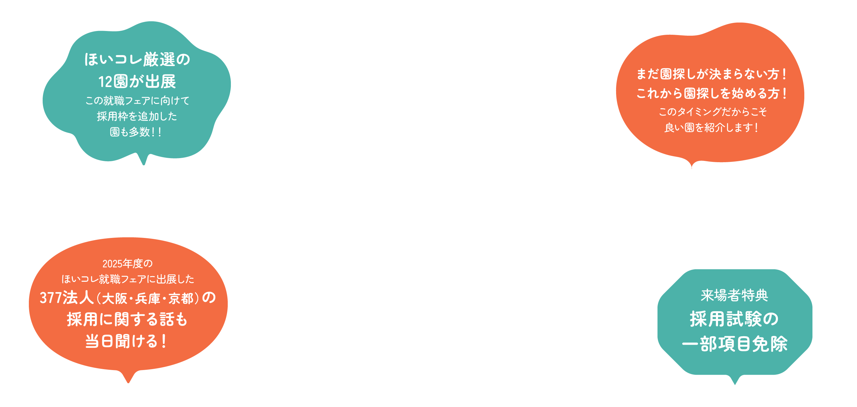 千早赤阪福祉会では、ほいコレ就職フェアに参加された方を対象に、採用試験の一部項目免除を実施いたします。免除内容は【特技披露】です。特技披露が苦手な方や緊張しやすい方も、安心してご参加いただけます。また、園の雰囲気や職員の実際の声を直接聞ける貴重な機会でもあります。「少し気になる」という方も大歓迎です。ぜひお気軽にブースへお越しください。