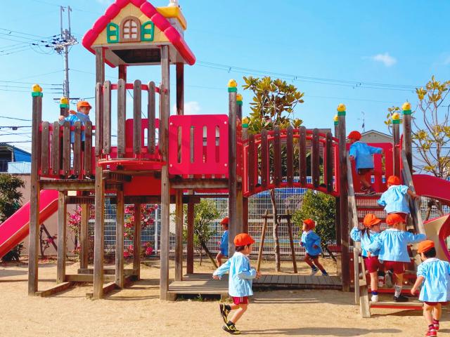 自然にかこまれた環境のなかで、四季折々の自然に触れたくさんの感動を味わうことができる保育をしています。園庭では、のびのびと楽しくあそでいます。
