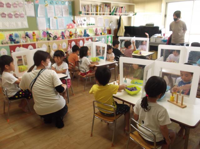 認定こども園としての教育的な配慮としては、毎週40分ずつの外部講師による音感教育と英語遊びを取り入れ、また数の概念を育てる工夫として数あそびをしています。
