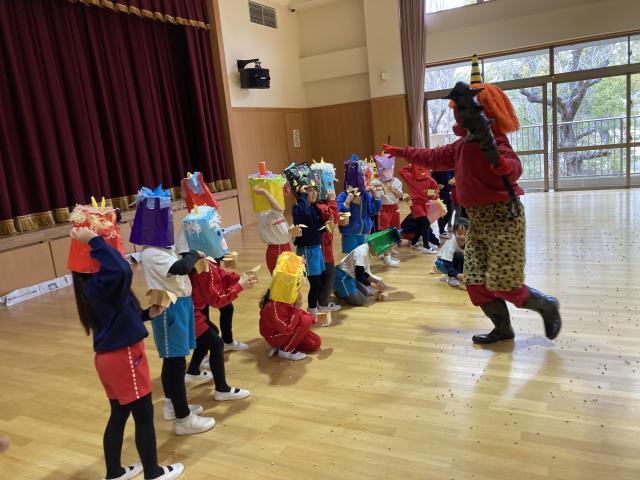 生活発表会です!昨年度は、クラスみんなのお気に入りだった「ノラネコぐんだんパンこうじょう」の絵本を題材に表現遊びを行いました。