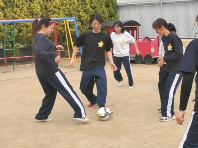 体育活動として、リズム遊びや園庭での運動、スイミング指導、サッカー指導を行っています。
