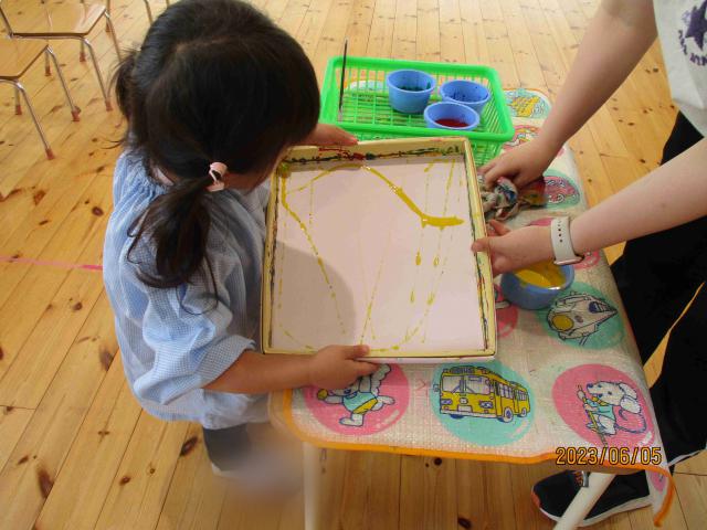 年長クラスの副担任をしています。主担任の先生と一緒に保育の内容を考えて計画を立てたり、保育中に子どもの様子を見ながら声掛けや必要であれば援助をしたり、ひらがなや音楽の指導もしています。