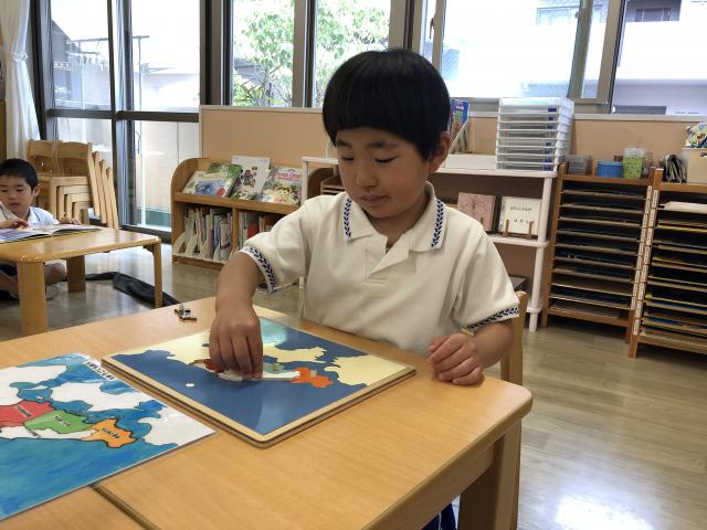 0歳から5歳児までの縦割り保育です。職員、担任はモンテッソーリ活動の中で子どもが自ら選んできた活動の援助をしていきます。