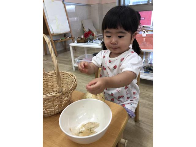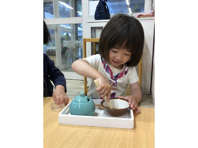 午前中は、モンテッソーリのおしごとをしていて、主に2歳児(移行児)、3歳児への提供や落ち着いた環境作り、おしごとのお手伝いなどをしています。