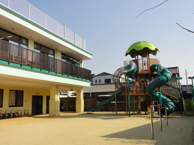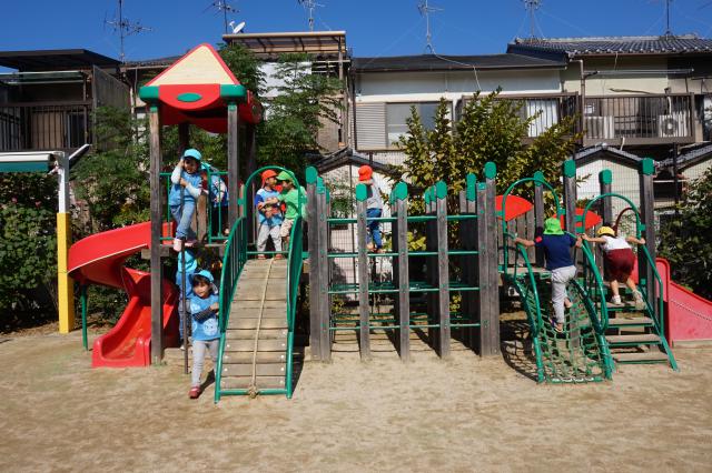 木のぬくもりにあふれ、日当たりのよい園舎、みかん・桑の実など花と実りいっぱいの園庭、築山や大型遊具など楽しい遊び場の整った屋外遊戯場など、子ども達がのびのびと過ごせる環境が整っています。
