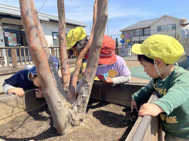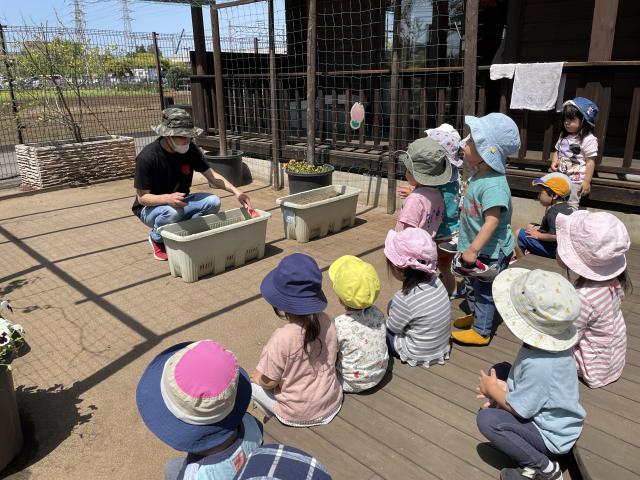 私たち園庭は芝生や様々な木々、花壇や畑といった自然に囲まれています。春にはうぐいすの声を聴き、夏はバッタやかぶとむしを触り、秋にはとんぼの観察、冬は雪遊び。四季を全身で感じながら保育を行うことができます!