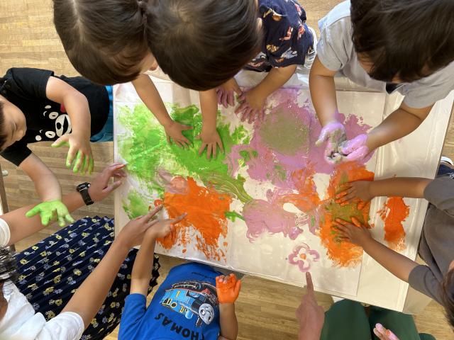 表現遊びです。表現遊びでは、お話の登場人物になりきって、音楽に合わせて身体で表現します。子どもと話し合い、登場人物の気持ちを考えたり、クラスみんなで作り上げることはとても楽しく、共に達成感を得ることができます。