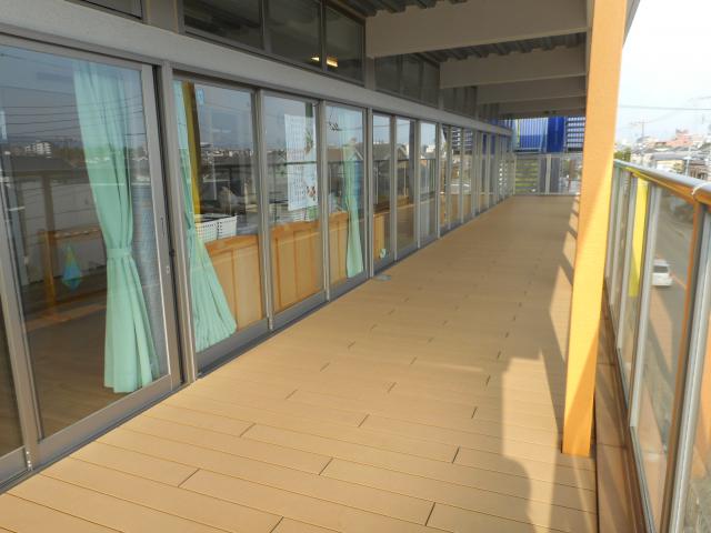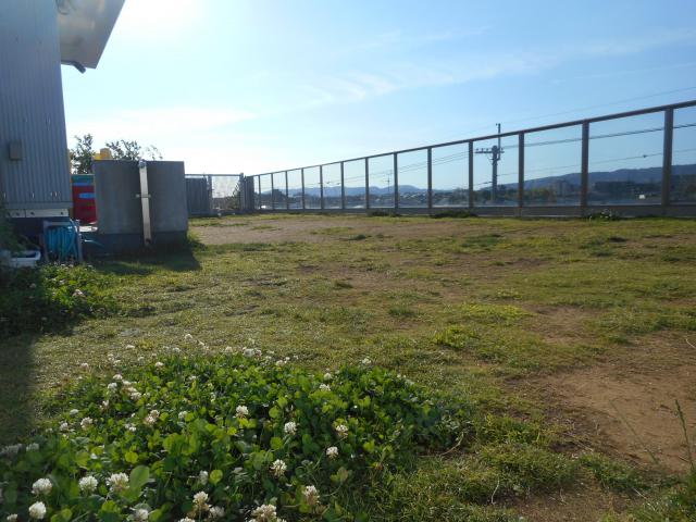 ?天然芝が広がる屋上園庭です。子どもたちと、所狭しと走り回ったり、ままごとをしたり、だんご虫を捕まえたりしています。6月中頃からは、子ども達も保育者も裸足になって水遊びを楽しんでいます。秋には、どんぐりが実をつけ子ども達と拾ったり、姫りんごを収穫しておやつで食べたりしています。