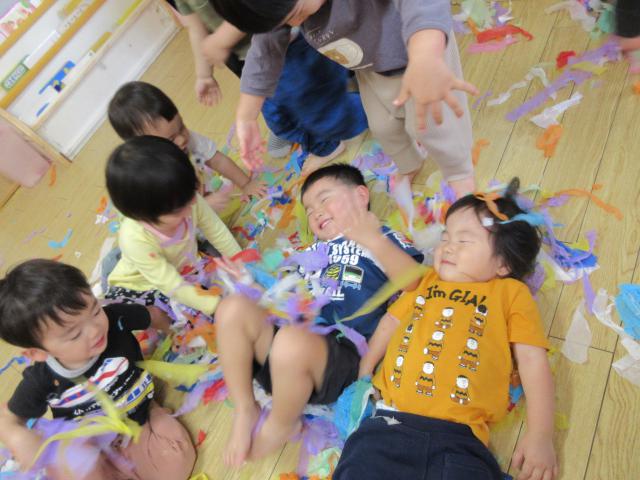 お部屋で子どもたちはブロックで遊んだり、トンネル潜り、滑り台、お絵描きやシール貼りをしています。感触遊びも大好きな遊びです♪