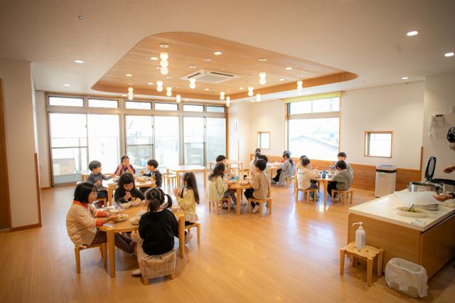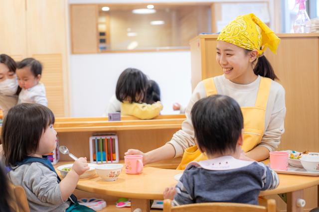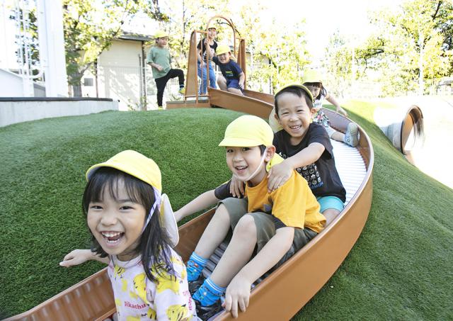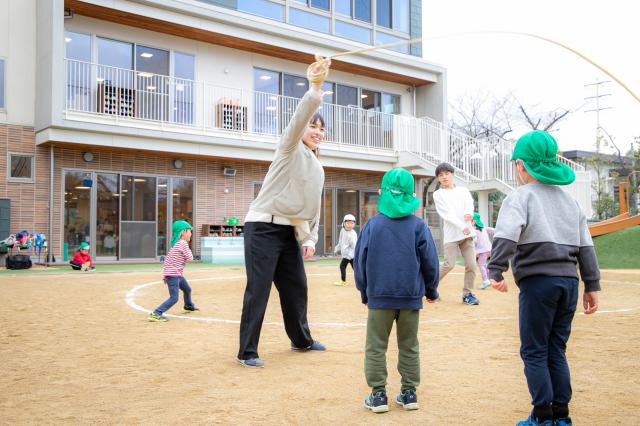 子どもたちが『安全で安心して過ごせる環境の中で、やってみたい!を実現してほしい』と願い、日々保育をしています。園内は、自然光が沢山入り、木の温もりを感じる事が出来ます。園庭に出ると、季節毎に彩りを変える樹木や築山、大きな砂場が子どもの遊び心を刺激します。そのような環境の中で、子ども一人ひとりに丁寧に寄り添いながら、様々な道具・素材を準備して、一人ひとりの『やってみたい』気持ちを応援できる環境作りに力を入れています。季節やその時の子どもの興味関心に合わせて環境を整え、子どもたちが自発的・主体的に日々の生活を営んでいけるように工夫しています。
