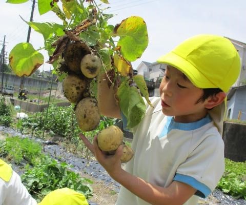 近隣の田畑へ散歩に出かけると、草花や生き物に出会い、様々な発見をする子どもたち。そんな子どもたちと同じ目線で発見を喜んだり、興味や関心をより深めたりして、遊びを通した学びを大切にしています。
