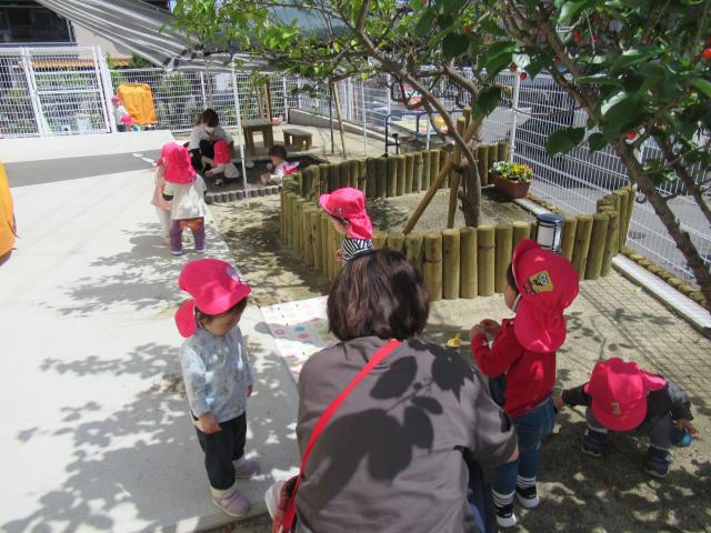 乳児クラス(特に0・1歳児クラス)は、子どもたちの家庭での生活を考慮し、それぞれのリズムでの生活を大切にしています。生活面は、できるだけ担当者が援助する様に心がけています。遊びについては、保育者が誘導するのではなく、それぞれの遊びだす姿を大切に捉え、寄り添うように保育しています。乳児クラスの発表会・運動会などの行事はありません。