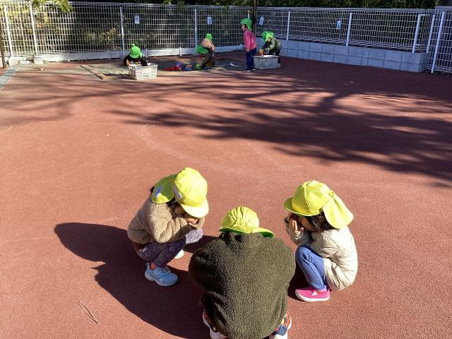 2階のベランダからは、天気が良ければ富士山を眺めることができます。砂場がある園庭には、松ぼっくり、どんぐり、シロツメクサ、蟻、だんごむし…と、みんなの大好きが沢山あります。
