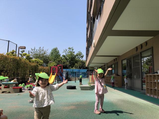 晴海こども園の子ども達は、園庭で花や野菜を育て、小さな生き物を見つけては目をキラキラと輝かせています。近くには緑に囲まれた公園や運河があり、のびのびと過ごしています。