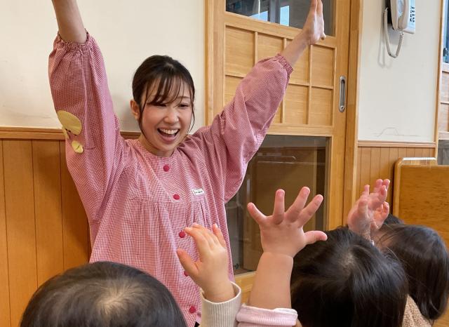 働いています。広々として綺麗な園舎、園庭は1階に砂場園庭、屋上には安田式遊具があり、子どもたちは好きな遊びを見つけ、自分の能力の少し上を目指し、挑戦しながら遊んでいます。近くには公園や神社があり、お散歩によく出かけます。新卒の先生には育成担当教諭が付き、1年をかけて丁寧にサポートしますので安心してください。