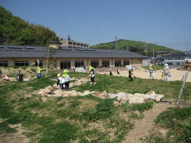 園庭がひろいのでお天気の日は園庭でどろどろになりながら遊んでいます。